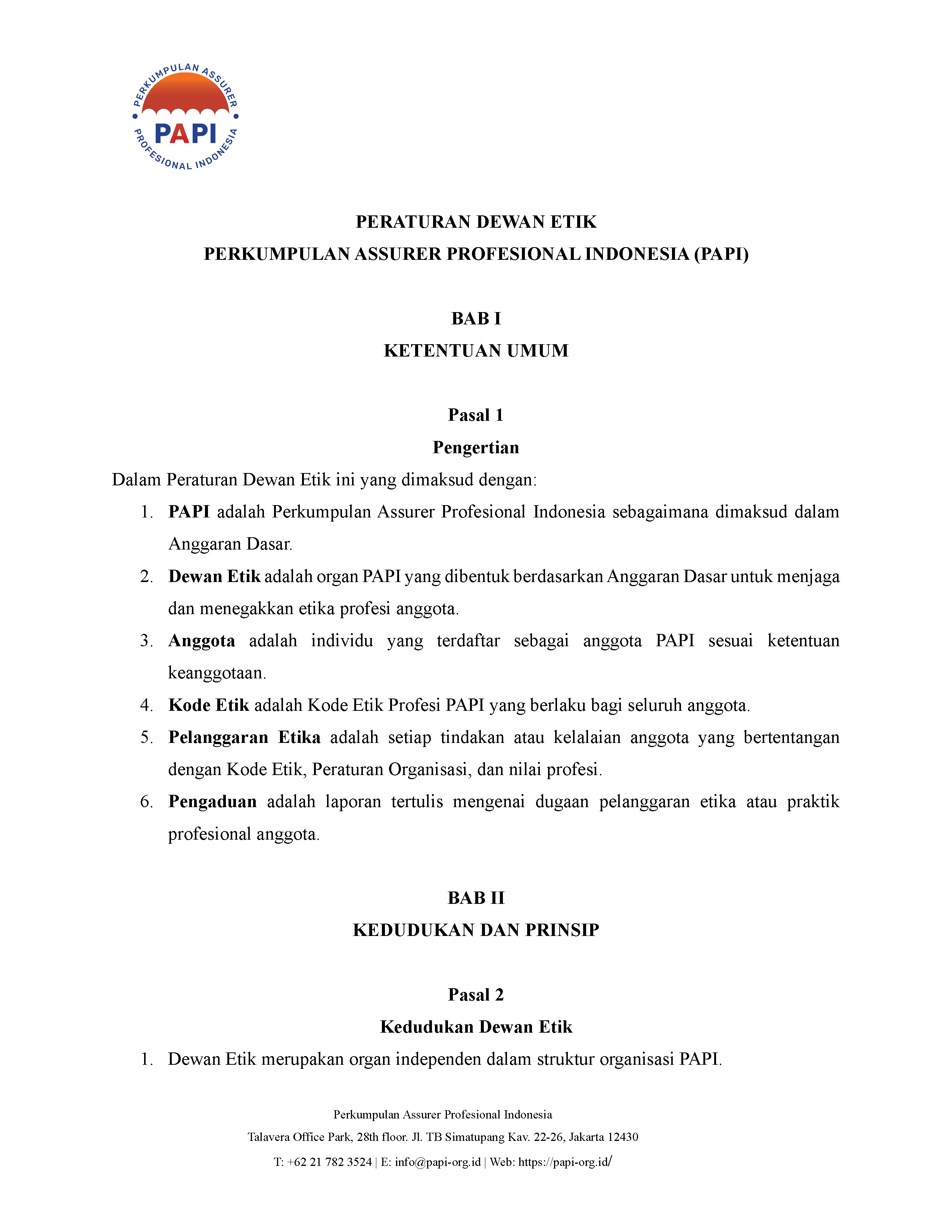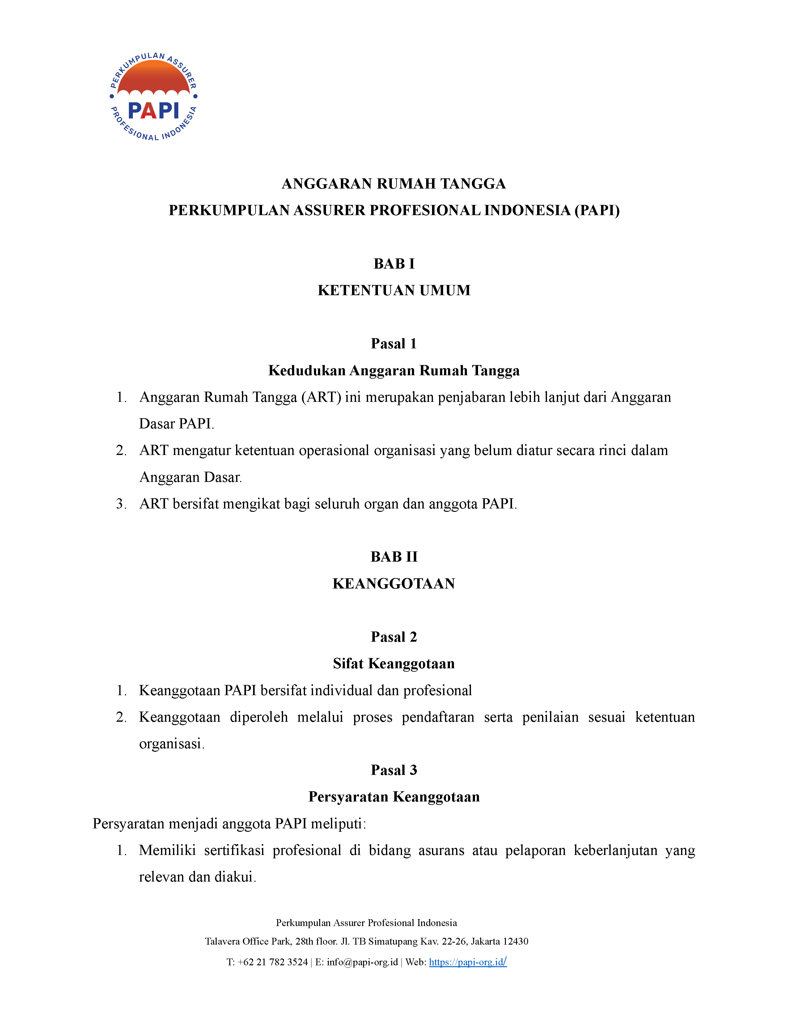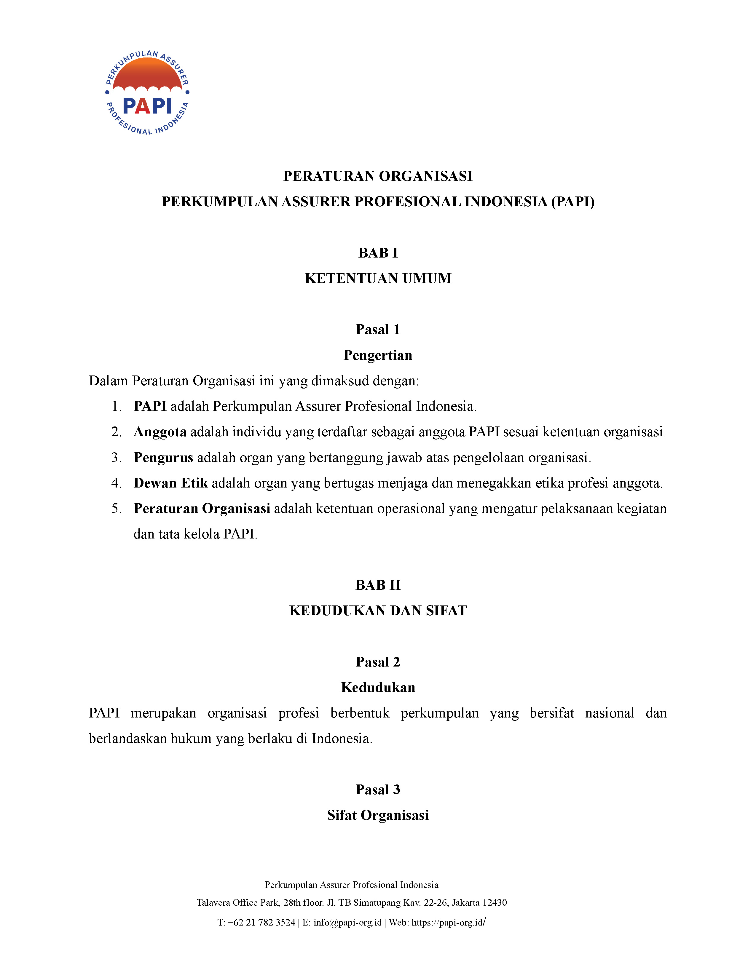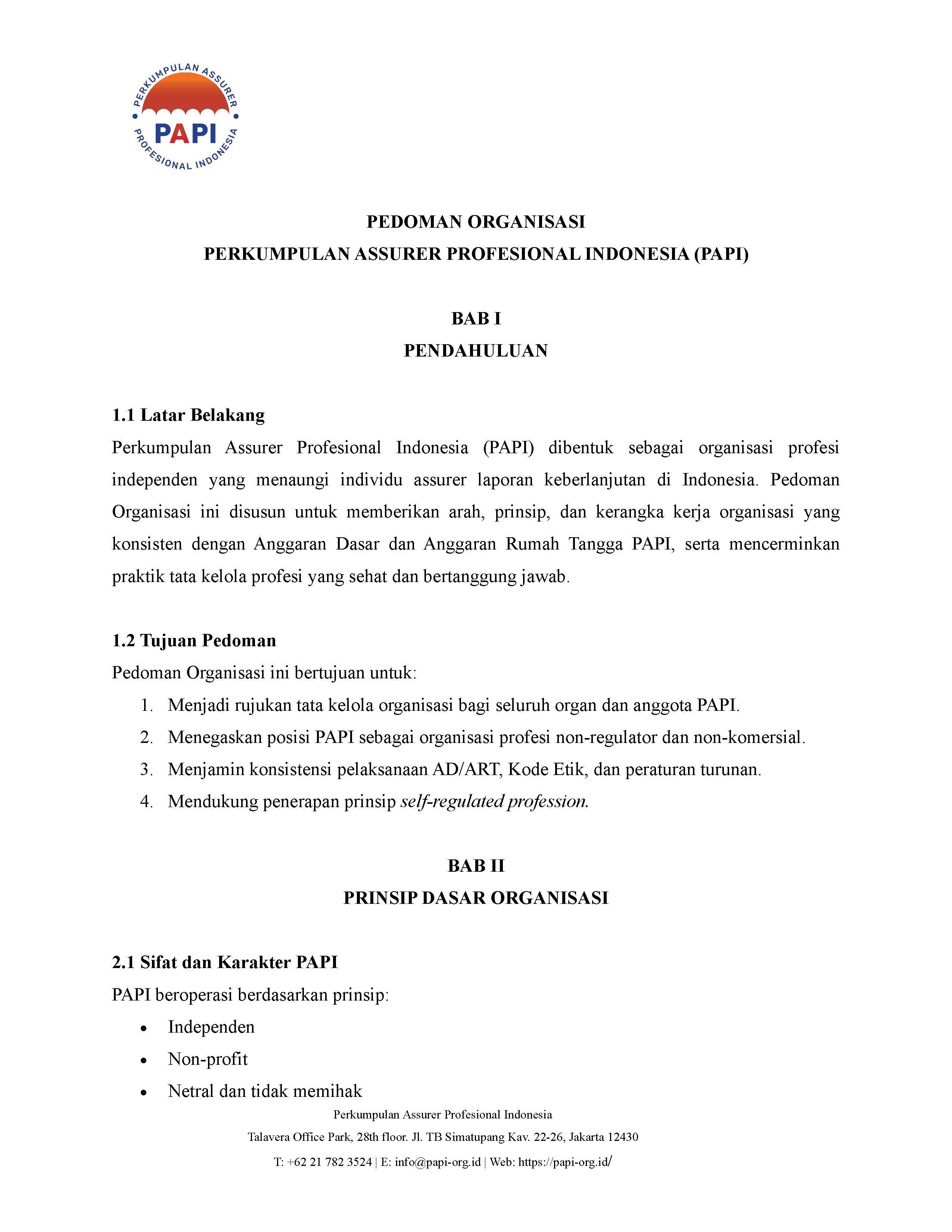 Kerangka dan ketentuan dasar pengelolaan organisasi PAPI secara keseluruhan